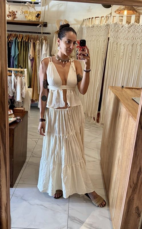Los tirantes ajustables permiten adaptar el ajuste, mientras su caída ligera en algodón artesanal mexicano aporta frescura y textura orgánica. Una pieza que equilibra sensualidad y suavidad, pensada para acompañar faldas amplias, días cálidos y atardeceres frente al mar.