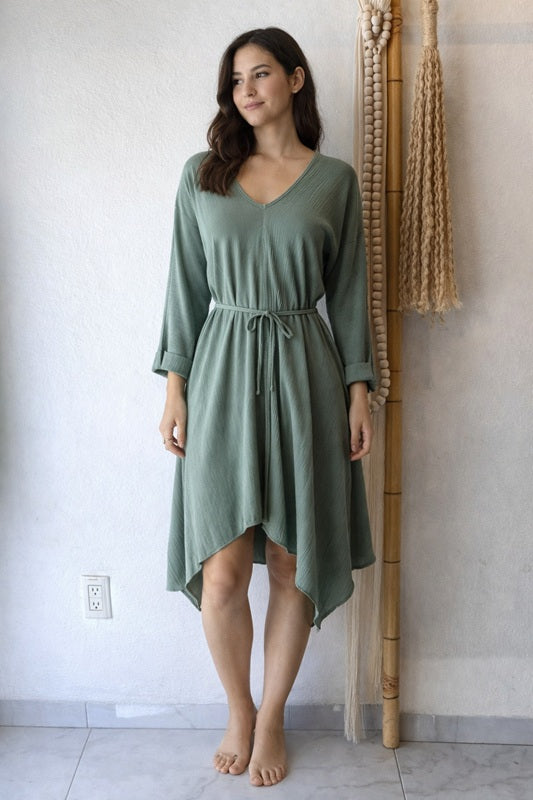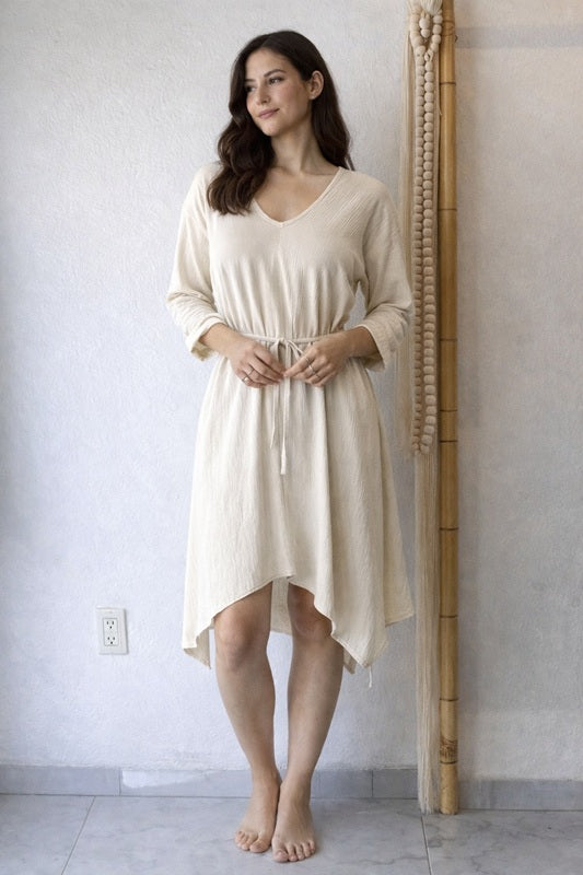 La cintura se define con un lazo ajustable que permite adaptar la forma al cuerpo sin perder comodidad. Su falda asimétrica añade dinamismo al diseño, creando una sensación orgánica y elegante al caminar.