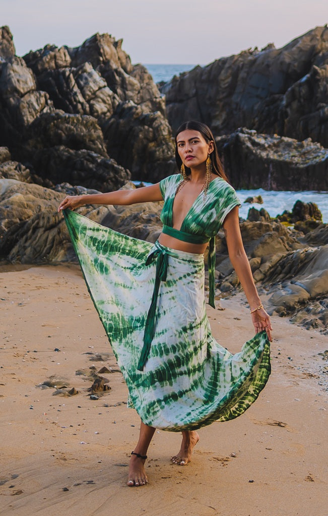 Gracias a su ajuste en cintura, puede usarse de distintas formas: como falda clásica, pareo o incluso como vestido corto cruzado. La amplitud del diseño permite que el teñido artesanal se exprese con libertad, generando composiciones orgánicas que transforman cada pieza en una versión única del modelo.