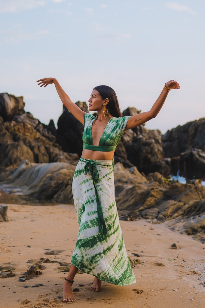 La Falda Flora Tie Dye es movimiento en estado puro. Su diseño envolvente circular y largo midi crea una silueta fluida que se adapta con suavidad a cada cuerpo, acompañando el paso con ligereza y naturalidad.