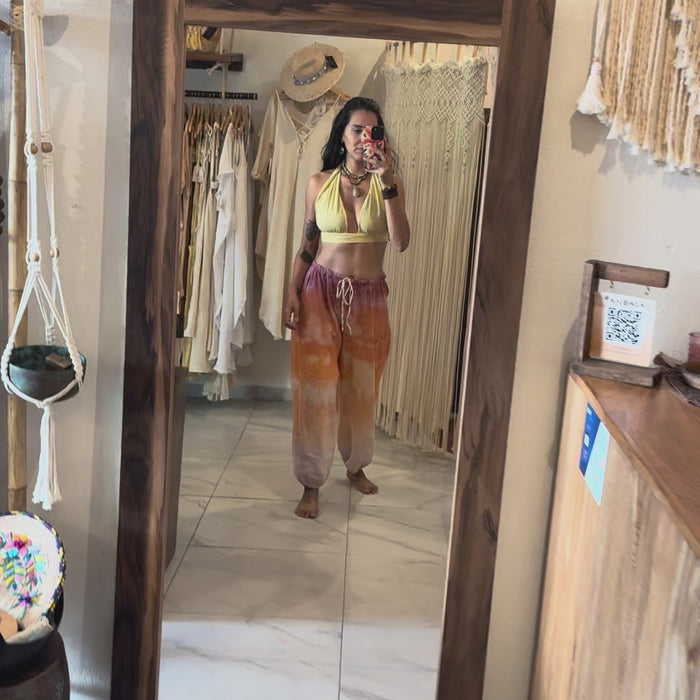 El efecto tie dye, trabajado a mano con pigmentos naturales, genera matices y transiciones de color que aportan profundidad y movimiento a la prenda, resaltando la textura del algodón y su fluidez al caminar.