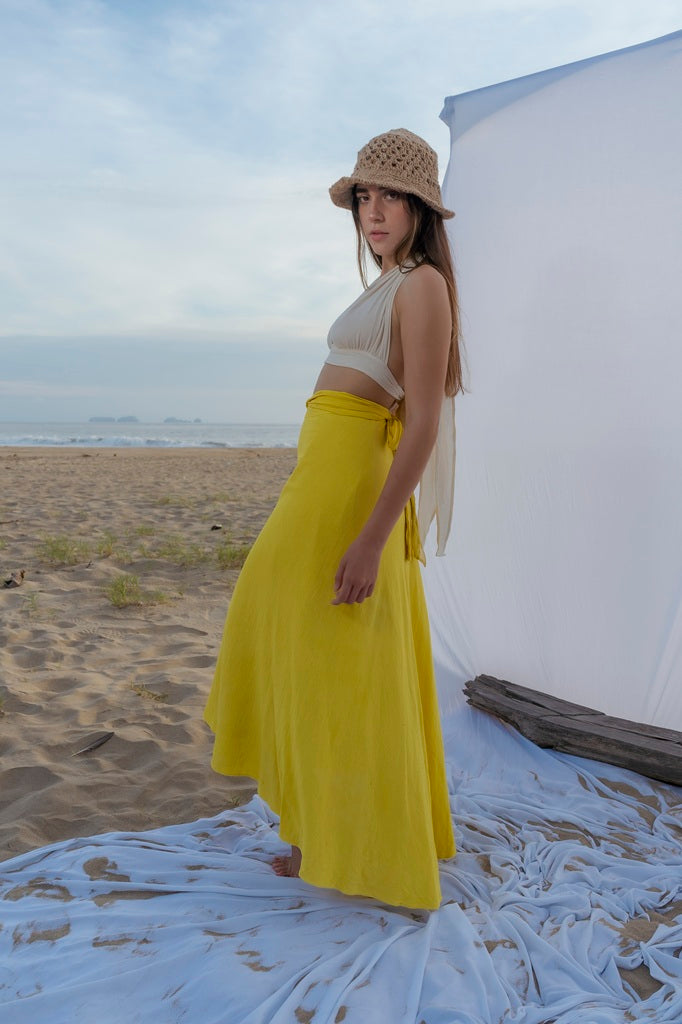La Falda Flora es sinónimo de movimiento y libertad. Su diseño envolvente circular y largo midi crea una silueta fluida que se adapta a cada cuerpo con suavidad y elegancia. Gracias a su ajuste en cintura, puede usarse de distintas formas: como falda clásica, pareo o incluso como vestido corto cruzado.